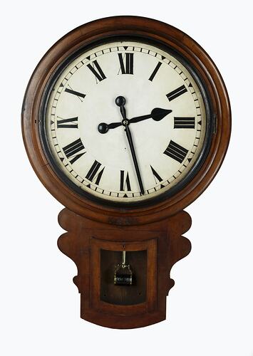 Made by Thomas Gaunt & Co, Bourke Street, Melbourne. According to an article in the VR Newsletter (Feb 1964), this was the government-owned Victorian Railway Department's first clock and was installed at the former Spencer Railway Station (now Southern Cross Station) in 1858, where it hung for 79 years on the wall outside the Stationmaster's Office, until replaced by a more modern timepiece in 1937. It was known by railway staff as "the main line starter clock", being used to ensure that all country trains departed prompty according to the scheduled timetable.