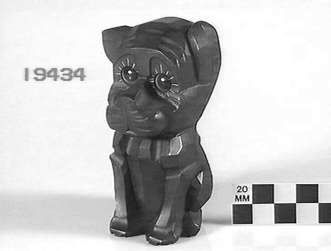 Dog clock, in which rotating eyes with a white mark in the pupil tell the time. Made in Germany, circa 1930.