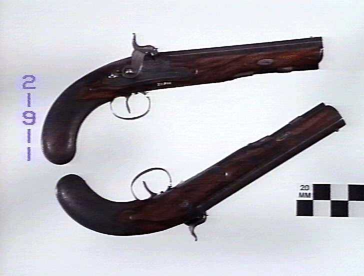 Muzzle loading, smooth bore, octagonal wire twist barrels 8 in. (203 mm.) long, with two platinum breech bands, backsight semi circular notch, nickel silver blade foresight, overall length 13 1/8 in. (334 mm.). Side lock & hammer with safety bolt, oval steel trigger guard with pineapple forward extension, set trigger. Wooden stock extends to muzzle, chequered grips, oval silver monogram plate. Wooden ramrod carried in two tail pipes.