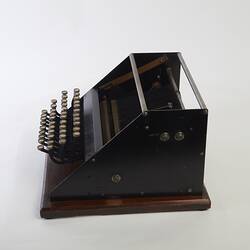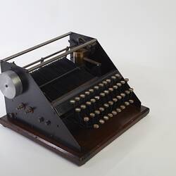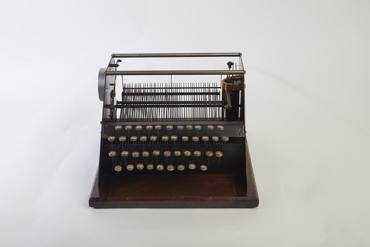 Alf Treager invented this typewriter accessory for his pedal radio (or wireless) set in 1931, specifically for people living on remote outback homestead stations, who had difficulty learning Morse code. When the keys are operated, a metal bar (with impressions) beneath them strikes a metal shaft which sounds the corresponding Morse code for that letter to the transmitter.