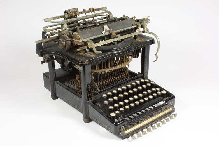 Typewriter of the type-bar class. It is a Remington Standard No.7, manufactured by Wyckhoff, Seamans & Benedict of Ilion, New York, U.S.A. The machine is an upstroke design, with the typebars arranged in a vertical circular basket. The serial number is 214799, indicating the year of manufacture as 1907.