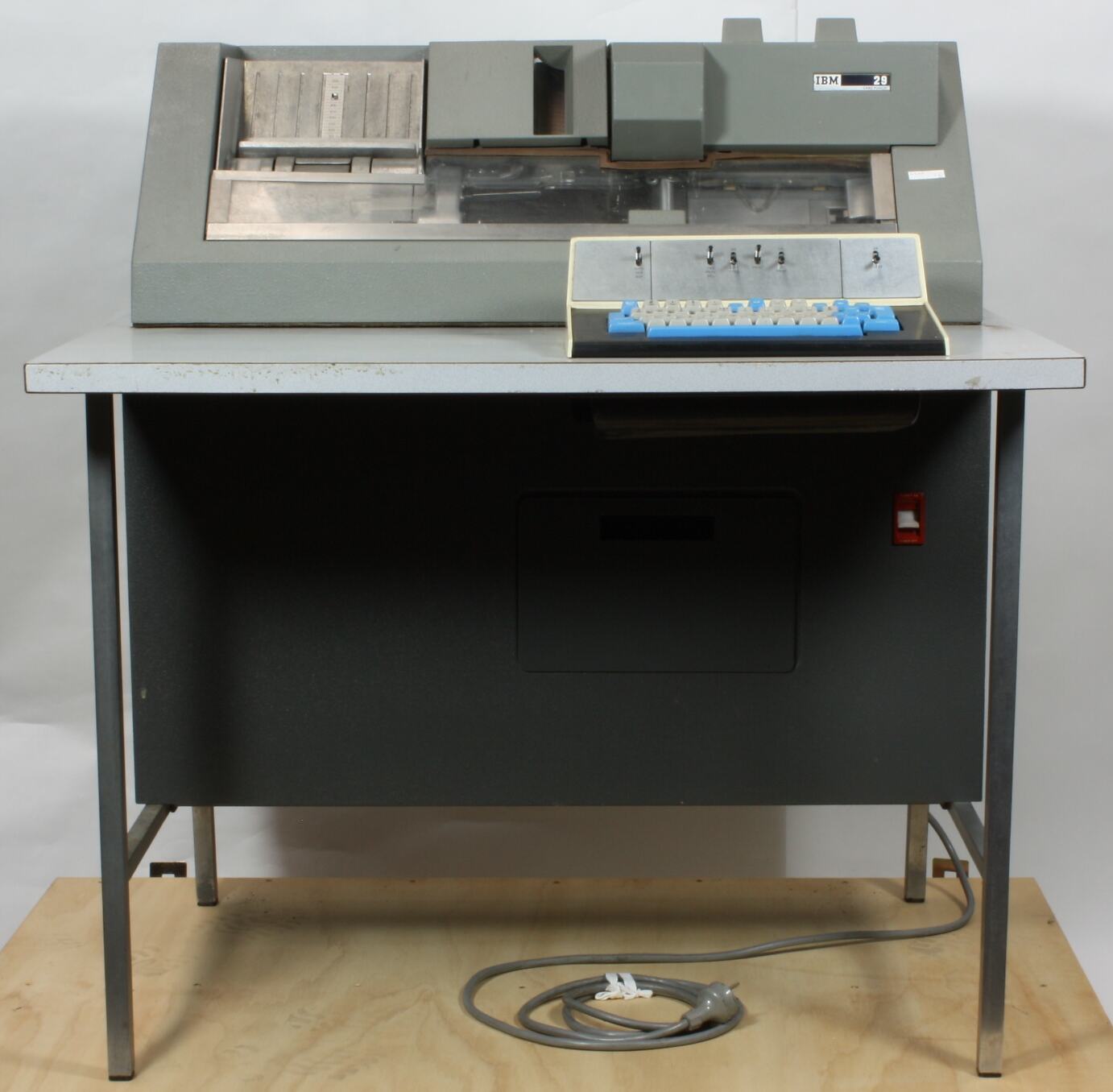 Metaltable supporting card punching device with QWERTY style keyboard in front on tabletop. Set of blank punch cards ready for punching on left hand side of punching device. A removable chard collecting box is located below the table top in the punching device. The box contains chards (rectangular).