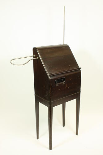 Sloping front lacquered wooden cabinet mounted on four thin legs. It has a hinged rest at the bottom of the sloping panel for printed music and a pair of doors at the back for access to the works. The two door knobs are missing. A vertical plated metal rod plugs into a holder on the right hand side of the instrument and a 'P' shaped loop plugs into a pair of receptacles on the left hand side. Inside the cabinet there are two metal chassis, one on the bottom of the cabinet and one on a shelf above it and two large coils, one at each side. The lower one is the power supply, the upper one contains the oscillators, the beat frequency generator and the audio amplifier. There is also a step-down transformer adjacent to the power supply chassis on the bottom to allow operation from 240 V mains. The bottoms of both doors are fitted with an 'L' shaped fitting on the inner side furthest from the hinge. These engage with a pair of safety switches intended to turn off the power when either door is open. The two switches that should be on the right hand side of the front panel have been removed also the pilot light between the pitch and volume controls has been removed.