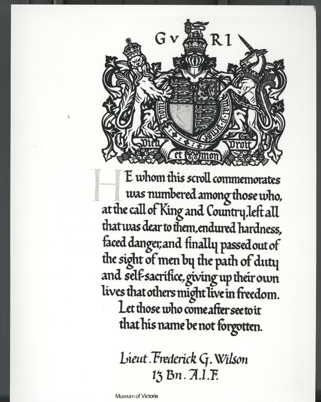The memorial scroll, on cream-coloured paper, is headed by a Royal Crest, partially coloured, with GV RI at the top and the slogan 'Dieu et mon Droit' at its base. The wording reads: 'He whom this scroll commemorates was numbered among those who, at the call of King and Country, left all that was dear to them, endured hardness, faced danger, and finally passed out of the sight of men by the path of duty and self-sacrifice, giving up their own lives so that others might live in freedom. Let those who come after see to it that his name be not forgotten.' The name 'Lt. Frederick G. Wilson, 13 Bn. A.I.F.' is hand-written in ink at the base of the document.