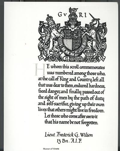 'He whom this scroll commemorates was numbered among those who, at the call of King and Country, left all that was dear to them, endured hardness, faced danger, and finally passed out of the sight of men by the path of duty and self-sacrifice, giving up their own lives so that others might live in freedom. Let those who come after see to it that his name be not forgotten.' Lt. Frederick G. Wilson, 13 Bn. A.I.F.