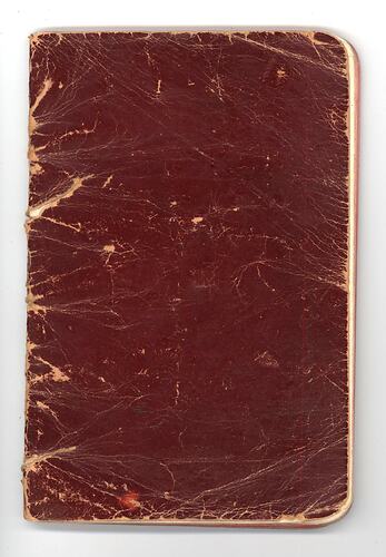 Two-volume hand-written diary. One notebook has a plain maroon cover. The other notebook has a black textured cover inscribed with the word 'Notes' on the front. It has an attached cloth band to mark the pages. Both notebooks contain handwritten entries in pencil.