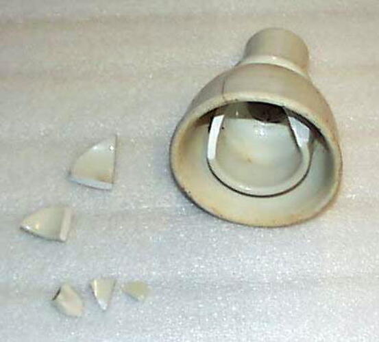 Insulator made of white porcelain. Cylindrical dome and umbrella-shaped outer skirt. Cylindrical. Includes several fragments from broken inner skirt.