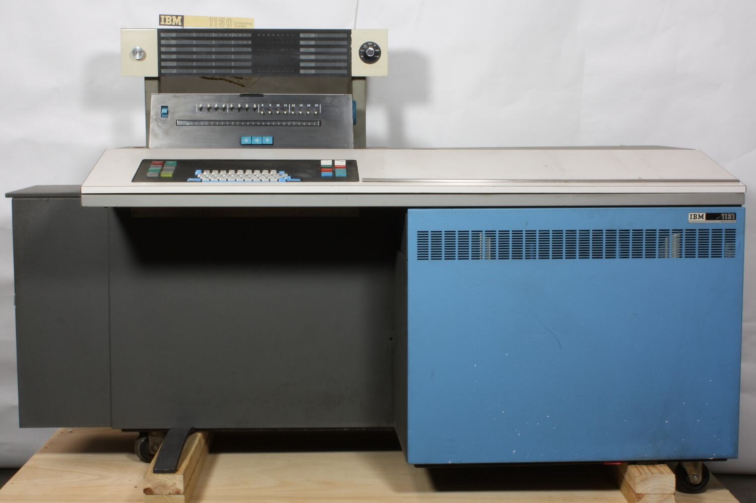 The system includes a CPU desk unit with keyboard, single data station, paper tape punch, twelve magnetic disk cartridges and 106 paper tape rolls containing programs and/or data, 16 blank paper tape rolls, equipment drawings, diagrams, print-outs, program listing and various documents and components. (1) CPU Desk Unit with Keyboard: Metal cabinet, finished variously in blue and grey, houses IBM 1131 Central Processing Unit. Console resting on top of cabinet extends to left to provide kneehole for operator. Console contains QWERTY keyboard between two sets of eight control push buttons. Printer located behind keyboard. Fifteen toggle switches on front panel of printer. Behind and above printer is rectangular box containing twelve digital displays and two control knobs. * Single Data Station: Beige and blue desk unit with keyboard, two diskette units, and display unit. The display unit is viewed through a periscope, which was refitted in July 2012; it is registered as a separate part: ST 043746.2. The rear panel can be removed; it has a holder containing a plastic pouch and a field engineering manual with blue plastic covers and ring binders. The manual includes an envelope containing three 8 inch floppydisks. The pouch contains a machine incident log and four miscellaneous items. * Paper Tape Punch: Grey metal box with crackle finish with controls on top, coiled cable at rear terminating with two plug-ins. On top rear, circular plastic container for reel of paper tape. Removable box contains chards from paper tape. * One of the magnetic disk cartridges: Circular beige plastic case encasing metal disk. Case exterior is shaped for use in computer disk drive. Metal disk is exposed on one side. On the other side, the central component of case is red.