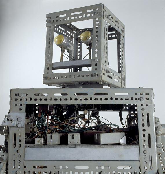 The robot was built from scratch using ready-made and surplus materials. The frame is made of 'Dexion' type shelving and the servo motors are war-surplus aircraft components. The wheels on which it moves are tail wheels from a P-51 Mustang fighter aircraft. It was operated by two 12 volt car batteries with a remote control panel connected by a cord.
