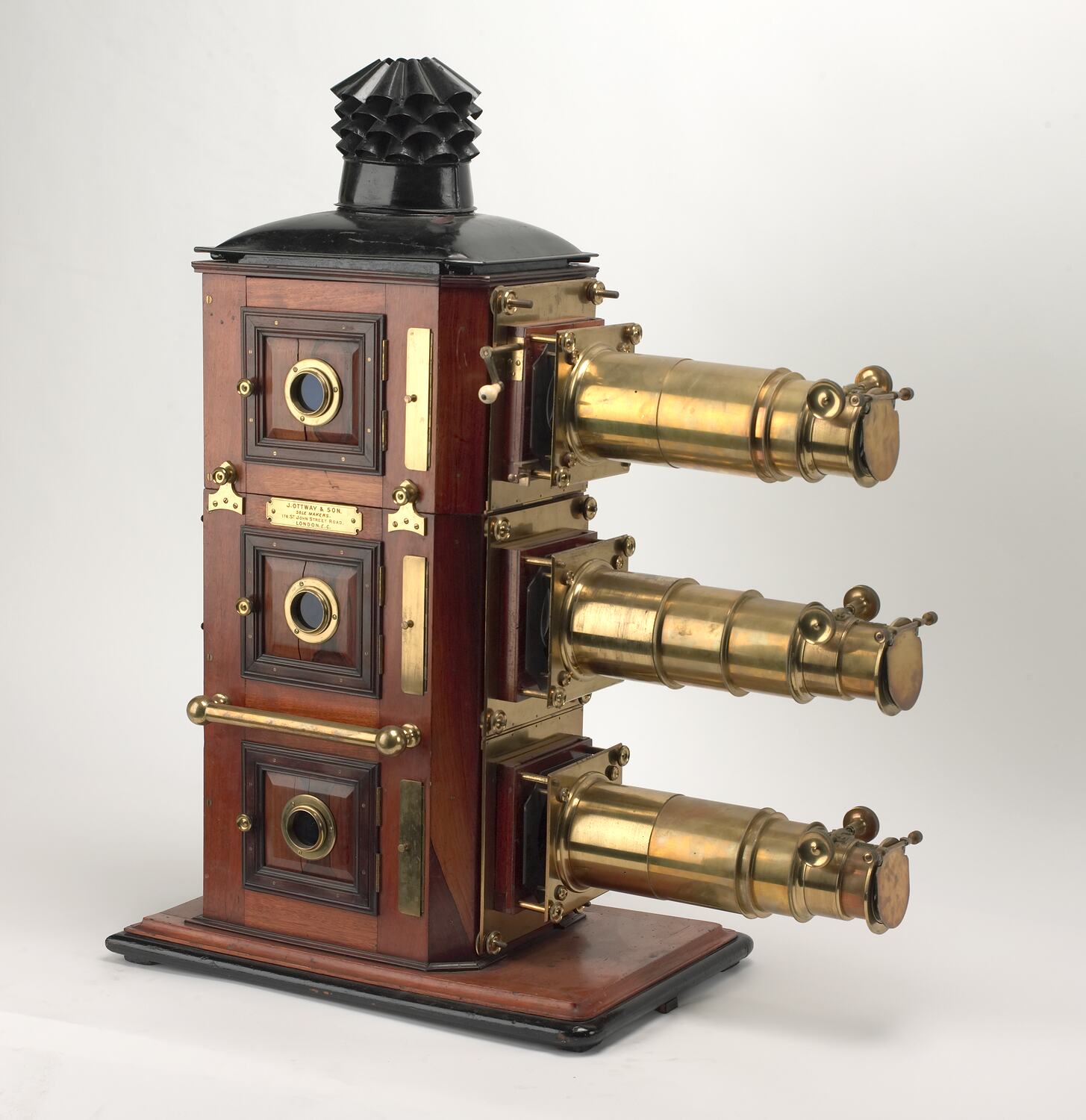 A triunial magic lantern projector, consisting of three individual projection systems which are integrated into one unit. The top unit can be separated from the lower two, creating a biunial and single lantern projector. Each of the projection systems incorporates an illuminant, slide holder and telescopic barrel, containing glass lenses.