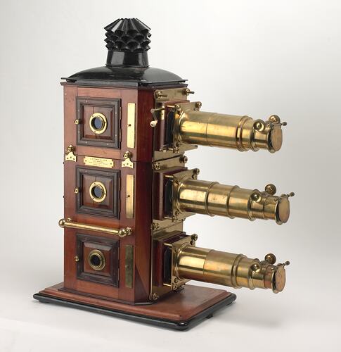 A projector with the body made of mahogany, with brass fittings and the three telescopic projector tubes made of brass, with glass lens systems. The power supply is modern mains electricity. A black metal cowl surmounts the object. The top projection unit can be separated from the two lower units to form a biunial and single lantern.