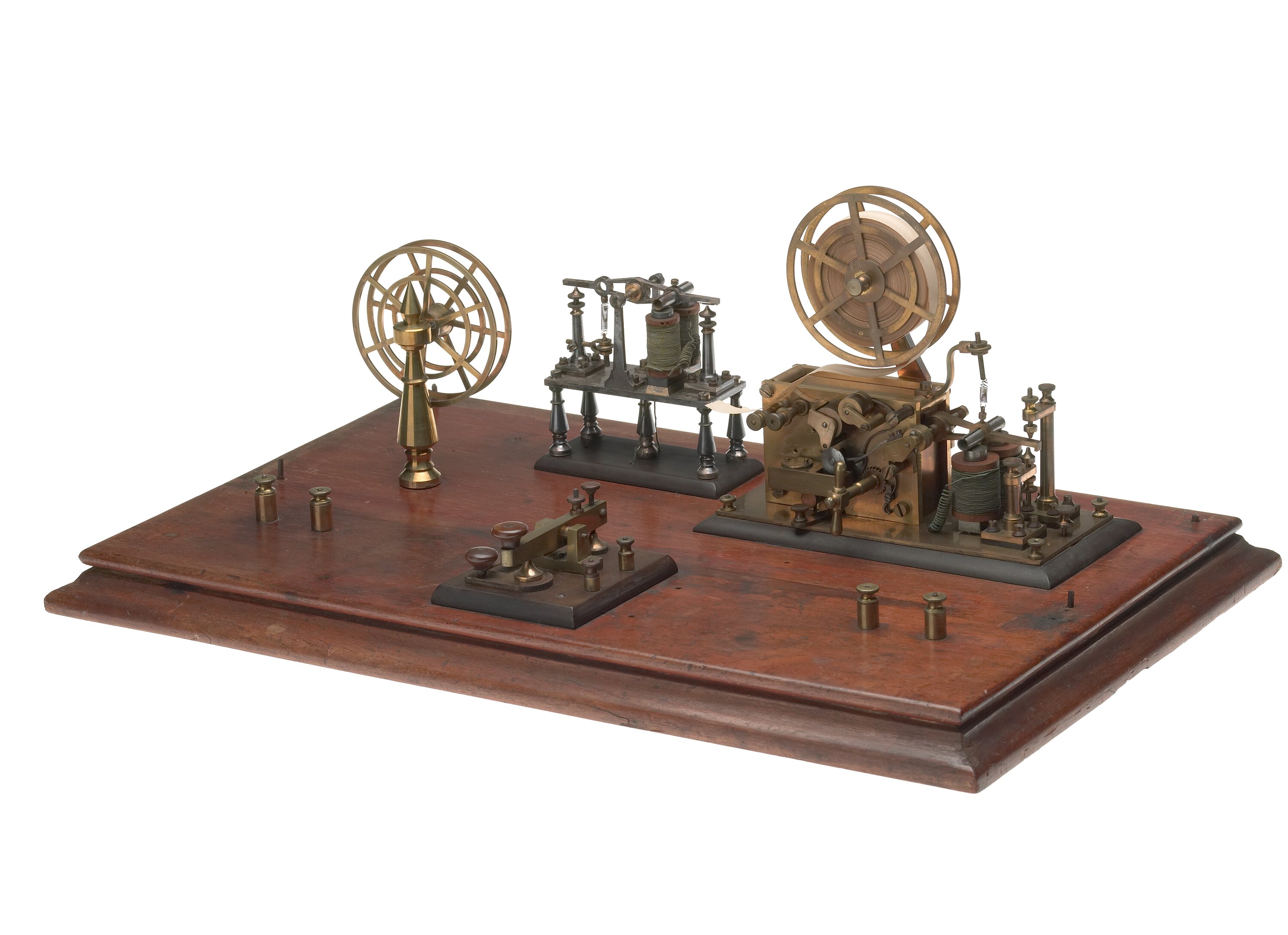 Model of a Morse telegraph set, to approximately half-scale, and consists of a key, a sounder, and an inking register (driven by clockwork), all mounted on a wooden baseboard.