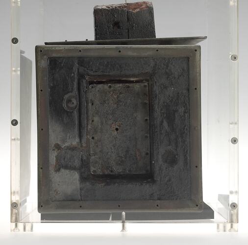A fire testing prototype of the ARL Flight Memory Recorder unit. This unit was tested by the Aeronautical Research Laboratories under extreme heat to ensure it would survive an aircraft accident and subsequent fuel fire.