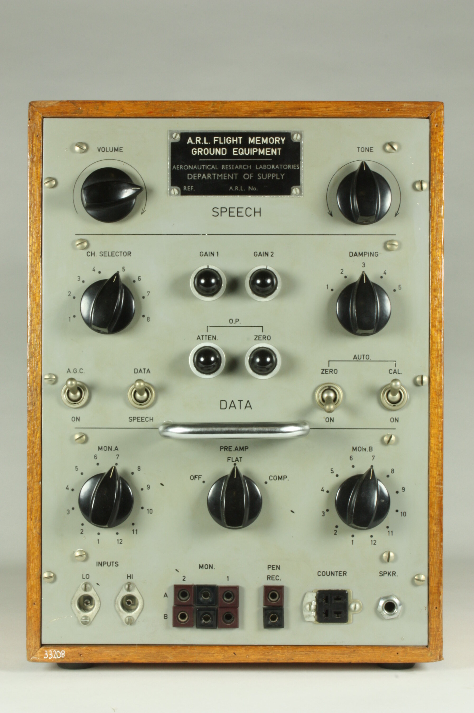 Ground-based unit for the prototype airborne ARL Flight Memory recorder unit invented by Dr David Warren. This unit is a playback station for separating cockpit speech and instrument reading recordings. The unit was first flight tested on 23 March 1962 on Fokker Friendship VH-CAV flying from Essendon airport.
