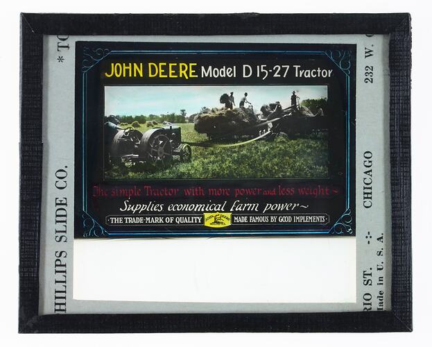 Colour glass slide advertisement featuring a John Deere Model D15-27 tractor. .It was made by Phillips Slide Co., Chicago, USA, circa 1930 for cinema use.
