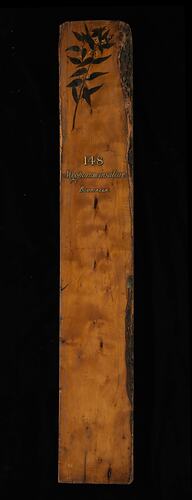 Prepared for exhibition purposes in the Industrial & Technological Museum in 1885. It features a hand painting of the species by Miss May Vale (later Mrs. Gilfillan). Exhibited at the following exhibitions: 1886 Indian and Colonial Exhibition, London; 1887 Jubilee Exhibition, Adelaide; 1888-89 Centennial Exhibition, Melbourne; 1889 Exposition Universelle, Paris.