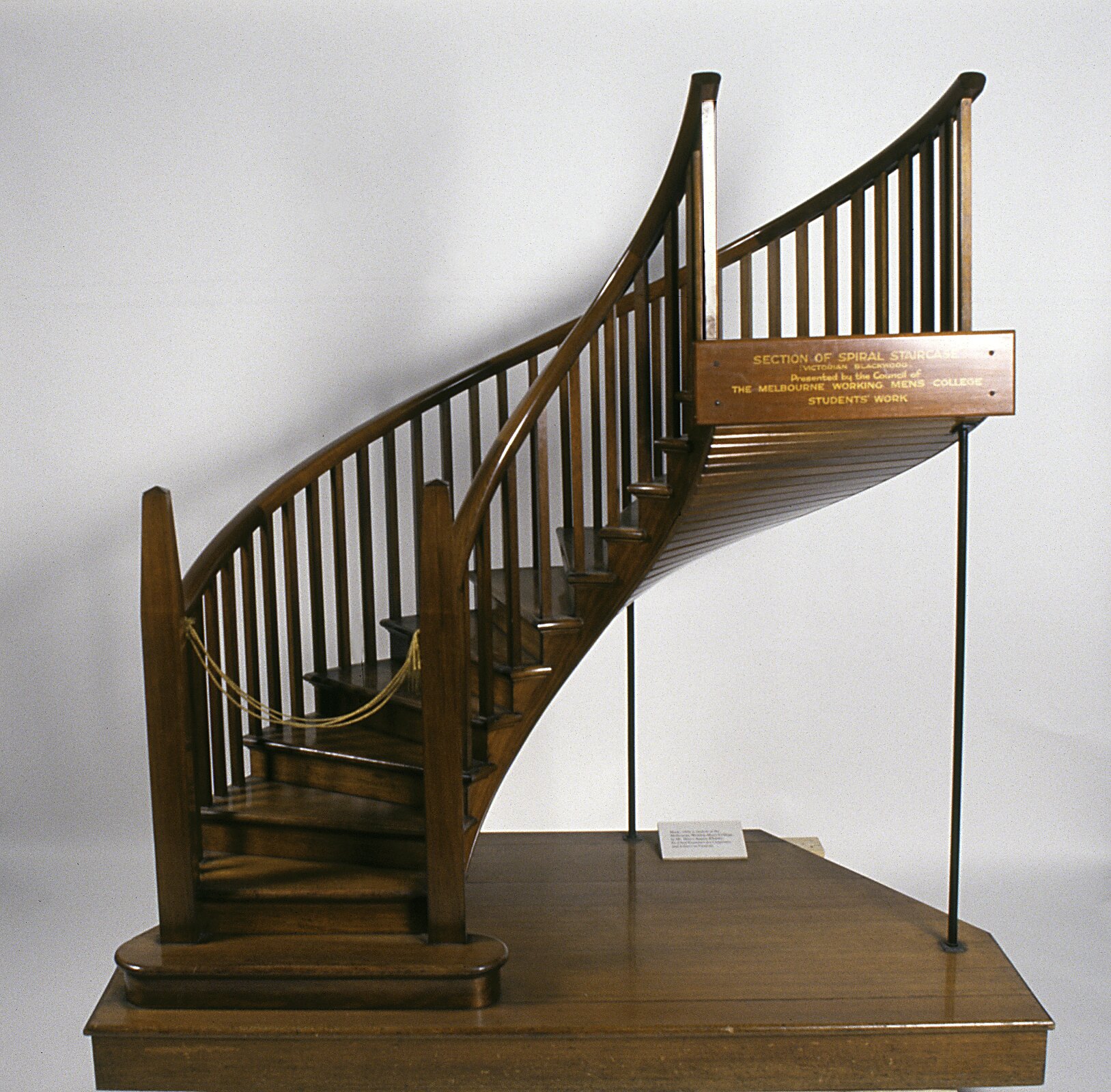 Model of a section of spiral staircase, constructed from Australian Blackwood (Acacia melanoxylon). Made by students at the Working Men's College, Melbourne, between October 1887, when a class in 'hand railing and staircase building' was first introduced at the Working Men's College and 22 February 1917, when the model was donated to the Industrial & Technology Museum (a predecessor of Museums Victoria).