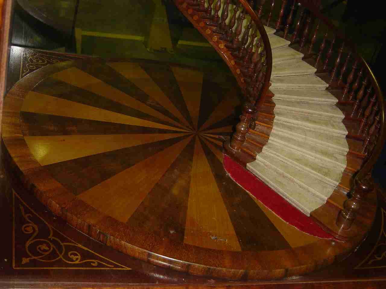 This model of a curved staircase with balustrades, with an ornamental display case with glass sides and a wooden floor and ceiling. It is made from several Australian timbers including acacia, melanoxylon (Leguminosae) and blackwood. The staircase stands on a circular decorative wooden floor, with an inlaid circular design. This design is composed of several different types of timber arranged in wedges to form a circle. The lower section of the outside of the staircase is inlaid with circles in a paler wood, evenly spaced on both sides of the staircase. The balustrades are turned wood, and a cream carpet runner, extends the length of the staircase.