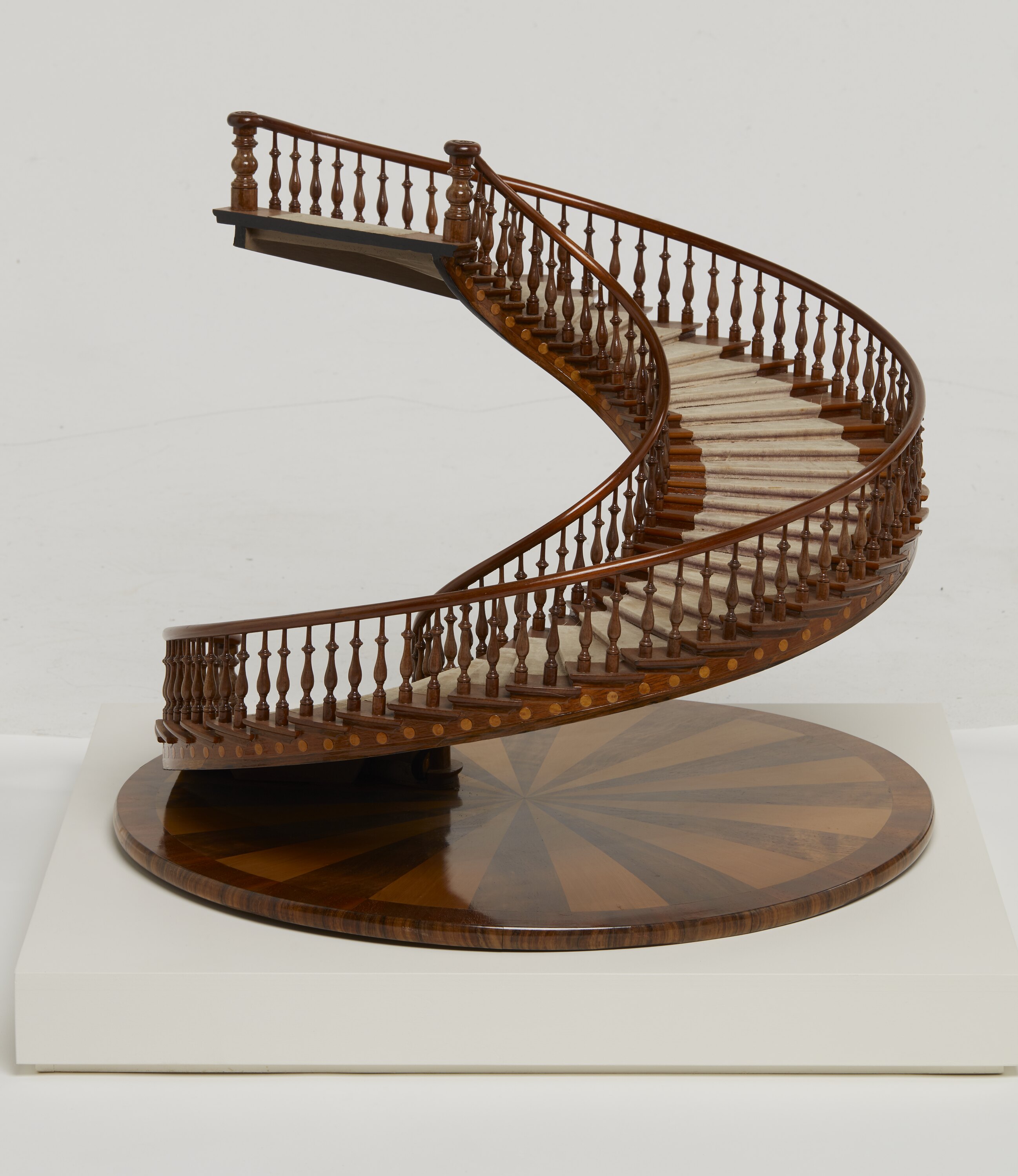 Model of curved wooden staircase with balustrades, housed in an ornamental display case with glass sides and a wooden floor and ceiling. The staircase stands on a circular decorative wooden floor, with an inlaid circular design. This design is composed of several different types of timber arranged in wedges to form a circle. The lower section of the outside of the staircase is inlaid with circles in a paler wood, evenly spaced on both sides of the staircase. The balustrades are turned wood, and a cream carpet runner, extends the length of the staircase.