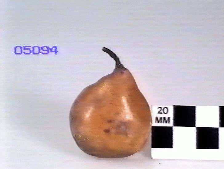Wax model of Saint Michel Archange pear, a dessert variety harvested in autumn. This variety is not in the 1974 edition of Ikin's listing of fruits.