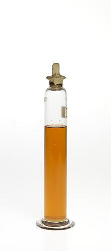 Oil sample in cylindrical glass jar with stopper and label.