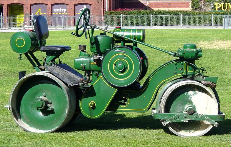 2-ton 3-wheeled Model LD Super Diesel footpath roller (serial no. 4007LD) manufactured by A.H. McDonald & Co., Richmond, Victoria, in about 1965. It is fitted with a SPI-type 4 horsepower 800 RPM single-cylinder horizontal 4-stroke pressure injection compression ignition engine with two solid flywheels and double dry-plate clutch quick-reversing mechanism. The LD was the last of a line of diesel powered footpath rollers starting with the CL in 1938 and progressing to the SL in 1950. The LD was introduced in 1960 and production ceased in 1969 after about 760 of all three types had been built. This type of small roller was used for footpaths and other areas with confined space and was popular with councils, contractors and public works bodies. One example was also sold to Mt Isa Mines Ltd. in 1950 and McDonald Imperial rollers have been used at the Adelaide Oval for many years to prepare cricket pitches for the summer season.
