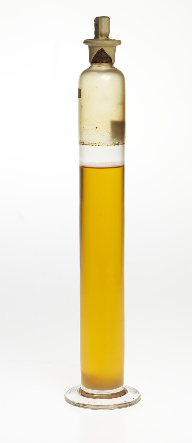 Oil sample in cylindrical glass jar with stopper and label.