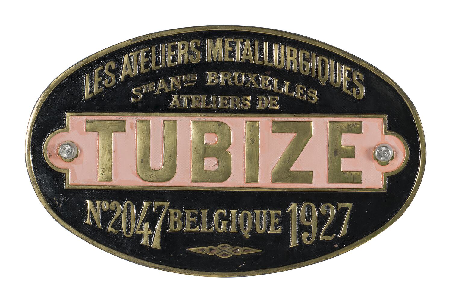 Brass oval locomotive builders plate, No. 2047, manufactured by Les Ateliers Metallurgiques, Ateliers de Tubize, Belgium, 1927.
