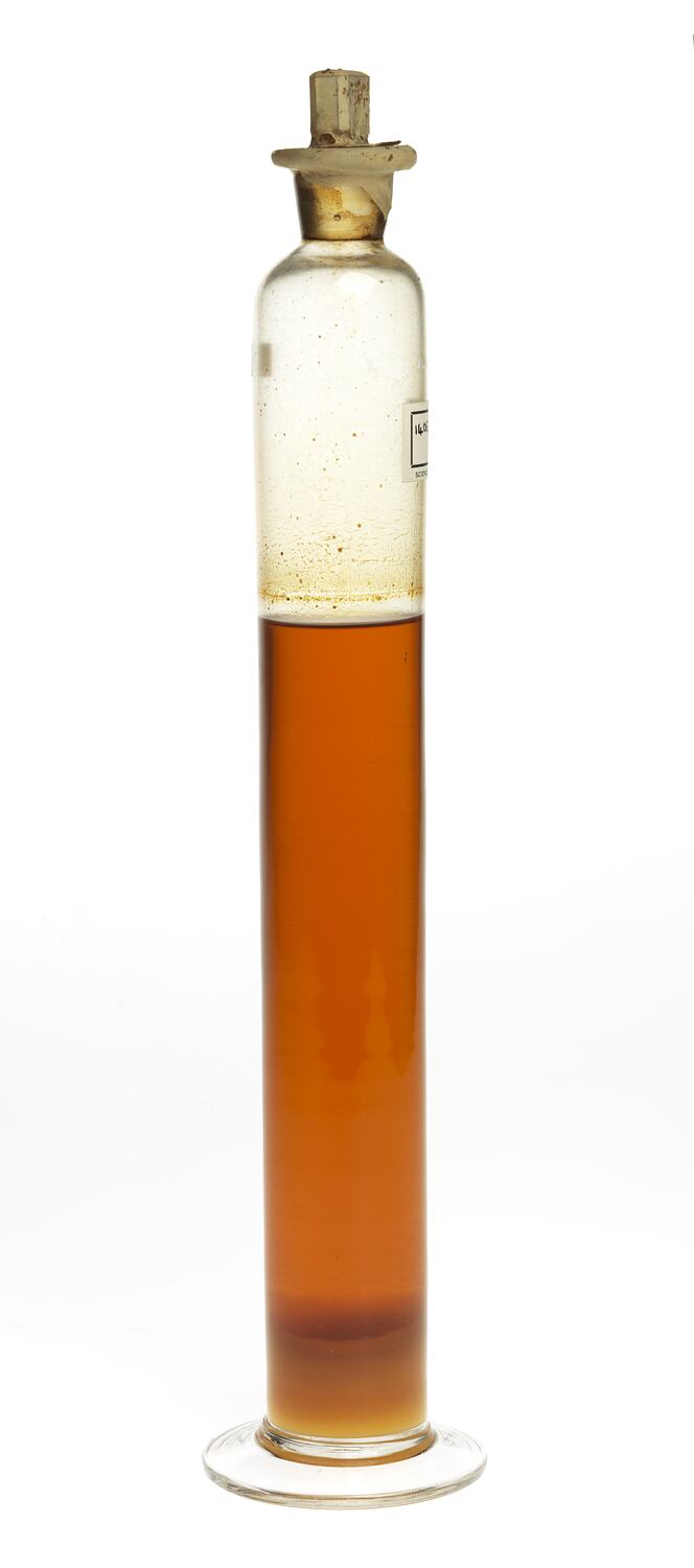 Crude oil sample of Eucalyptus occidentalis, also known as flat topped yate, mallet gum. Distilled from Narrogin, Western Australian material, pre 1922.