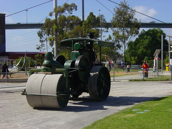 10-12 ton road roller was manufactured by A.H. McDonald & Co. at 570-574 Bridge Road, Richmond, Victoria, in 1925. This example was sold new to the Shire of Doncaster & Templestowe in August 1925 and was used by the Council on Road Construction work for the next 41 years before being traded in for a new road roller at A.H. McDonald's in June 1966. Following the acquisition of A.H. McDonald by Jaques in 1969 it was restored and placed on display at the Jaques-McDonald depot in Clayton. It was donated to the Museum in 1999 to be used in the operating machinery program at Scienceworks.