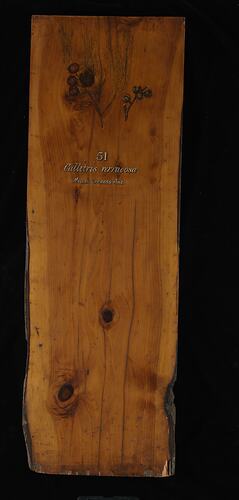 Prepared for exhibition purposes in the Industrial & Technological Museum in 1885. It features a hand painting of the species by Miss May Vale (later Mrs. Gilfillan). Exhibited at the following exhibitions: 1886 Indian and Colonial Exhibition, London; 1887 Jubilee Exhibition, Adelaide; 1888-89 Centennial Exhibition, Melbourne; 1889 Exposition Universelle, Paris.