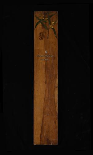 Prepared for exhibition purposes in the Industrial & Technological Museum in 1885. It features a hand painting of the species by Miss May Vale (later Mrs. Gilfillan). Exhibited at the following exhibitions: 1886 Indian and Colonial Exhibition, London; 1887 Jubilee Exhibition, Adelaide; 1888-89 Centennial Exhibition, Melbourne; 1889 Exposition Universelle, Paris.