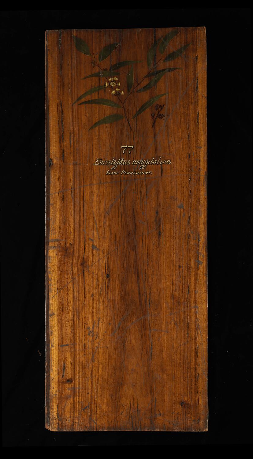 Prepared for exhibition purposes in the Industrial & Technological Museum in 1885. It features a hand painting of the species by Miss May Vale (later Mrs. Gilfillan). Exhibited at the following exhibitions: 1886 Indian and Colonial Exhibition, London; 1887 Jubilee Exhibition, Adelaide; 1888-89 Centennial Exhibition, Melbourne; 1889 Exposition Universelle, Paris.