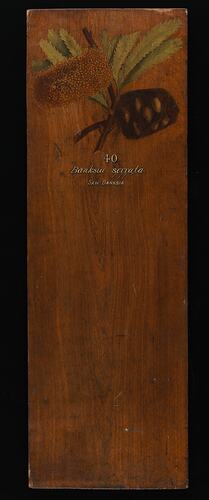 Prepared for exhibition purposes in the Industrial & Technological Museum in 1885. It features a hand painting of the species by Miss May Vale (later Mrs. Gilfillan). Exhibited at the following exhibitions: 1886 Indian and Colonial Exhibition, London; 1887 Jubilee Exhibition, Adelaide; 1888-89 Centennial Exhibition, Melbourne; 1889 Exposition Universelle, Paris.
