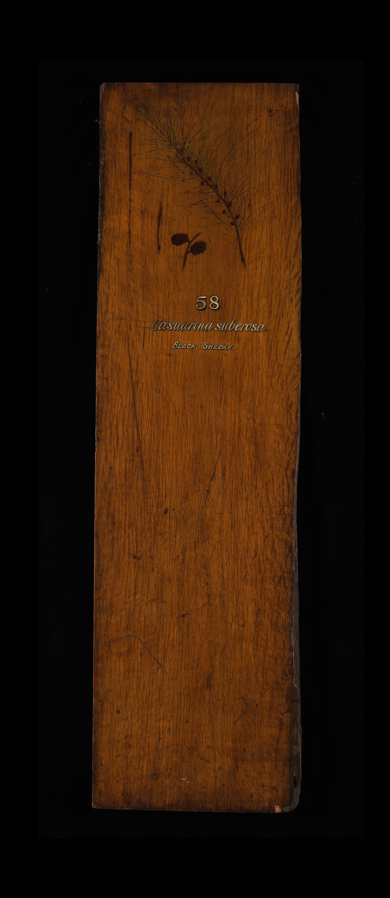 Prepared for exhibition purposes in the Industrial & Technological Museum in 1885. It features a hand painting of the species by Miss May Vale (later Mrs. Gilfillan). Exhibited at the following exhibitions: 1886 Indian and Colonial Exhibition, London; 1887 Jubilee Exhibition, Adelaide; 1888-89 Centennial Exhibition, Melbourne; 1889 Exposition Universelle, Paris.