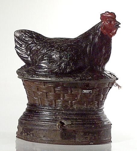 Metal, painted black with red face, comb and wattles. Slot for coin, and chute for eggs to roll down. The hen sits on a nest - a woven basket with soft material in the top. A stand below the basket with concentric rings provides a stable base.