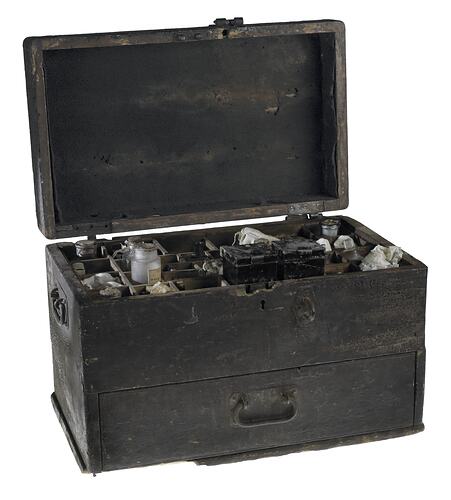 Heavy wooden box or chest with dove-tailed joints, top opening lid and single front opening drawer. Metal handles on each side and front drawer. Lid has built-in lock (broken) and off-centre external clasp for padlock, possibly added at a later date. Inside of lid lined with felt or similar fabric. Top section of chest contains a removable compartmentalised wooden tray containing various medicines or chemicals in corked glass bottles, as well as miscellaneous packages and tins.