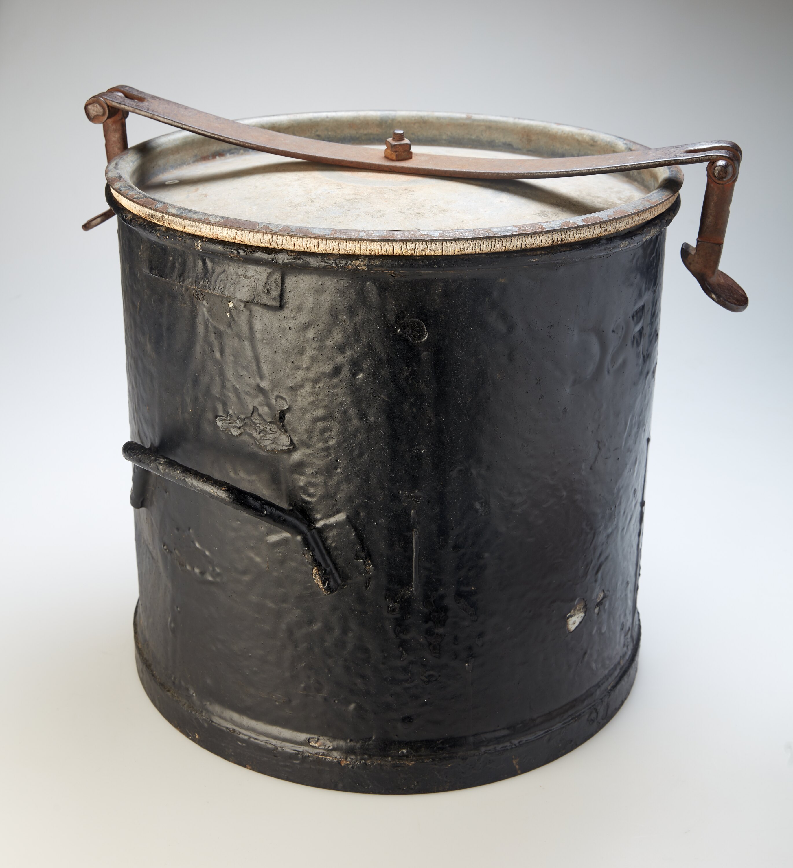 Painted metal sanitary pan with lid. The pan is cylindrical in shape and has a metal handle on each side. The lid has clips on each side. There is a black rubber seal around the lid of the pan.