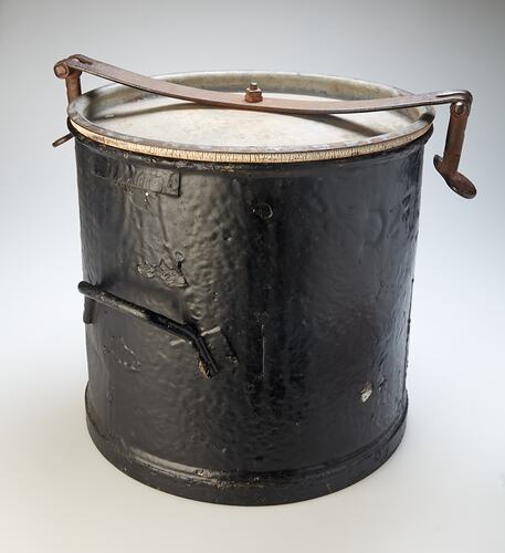 Night-soil or sanitary pan used for collection of toilet wastes. Also known as a nightman's pan. Nightsoil pans similar to this were widely used in many of Melbourne's suburbs prior to the construction Spotswood Pumping Station and the first sections of the Melbourne's underground sewerage system in the 1890s and early 1900s. Because sewers were only gradually extended to outer suburbs, often years or decades after they were first developed, night-soil pans continued to be used in many areas as an alternative to septic tanks or for temporary toilets such as those provided on building sites.
