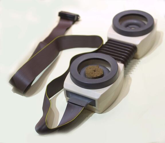 Sendata series 700 modem for use with conventional telephone handsets; comprises microphone unit joined by flexible coupling to speaker unit, with rubber surrounds on each to attenuate external noise. Full duplex 300 bits per second transmission and reception accepted by this type of modem. Made by Electromed in Victoria, Australia about 1975.