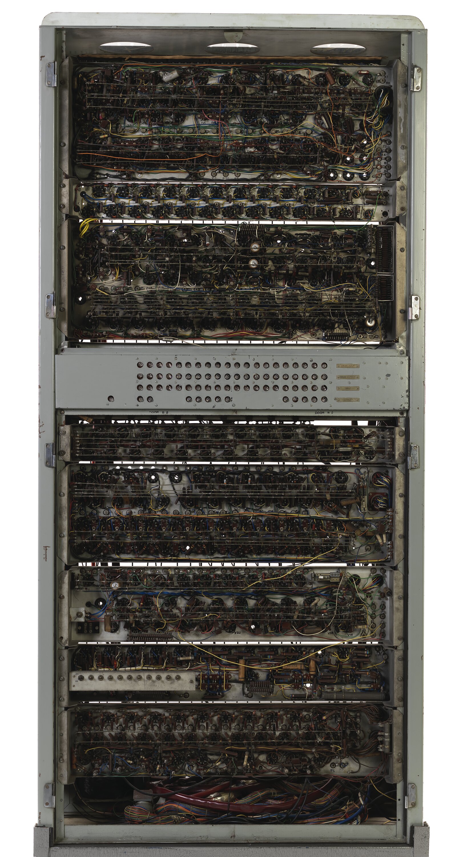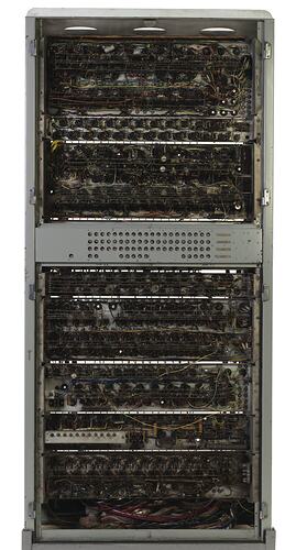 Cabinet holding the input and output control circuitry for CSIRAC (formerly CSIR Mk 1). The input devicess were 5-hole and 12-hole paper tape readers. The outputs were 5-hole and 12-hole paper tape punches and a teleprinter, which, in Melbourne, was located on the control cconsole.