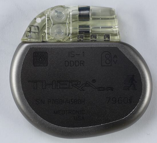 Pacemaker, model type Thera, manufactured by Medtronic in 1995. Includes leads and the stylet used for guiding leads through the heart valves. Titanium case with epoxy fittings and two titanium tipped leads. Has an expected battery life of up to 20 years. Contains silicon chip allowing for computer-controlled monitoring and adjustement. Also includes small torsion wrench for attaching leads to pacemaker.