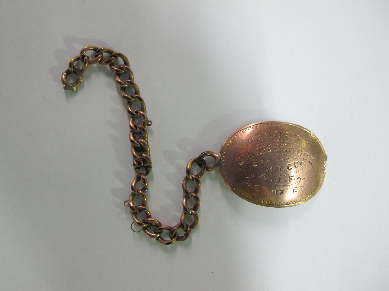 Gold identity tag for wear on the wrist. Worn by Jack Wedgewood during World War I.