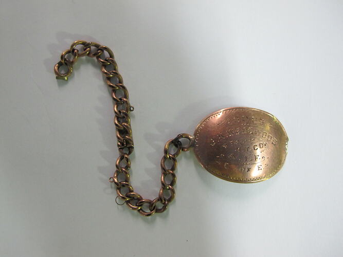 Engraved, front: 13085/J.K. WEDGWOOD/4TH M.T. COY/A.I.F./C. OF E. Stamped, reverse: 9ct.