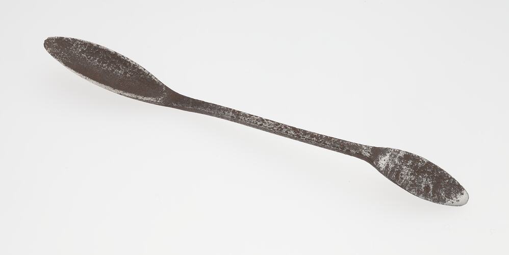 Metal tool with two oval shaped flattened ends at slight angles from the saft of the tool.