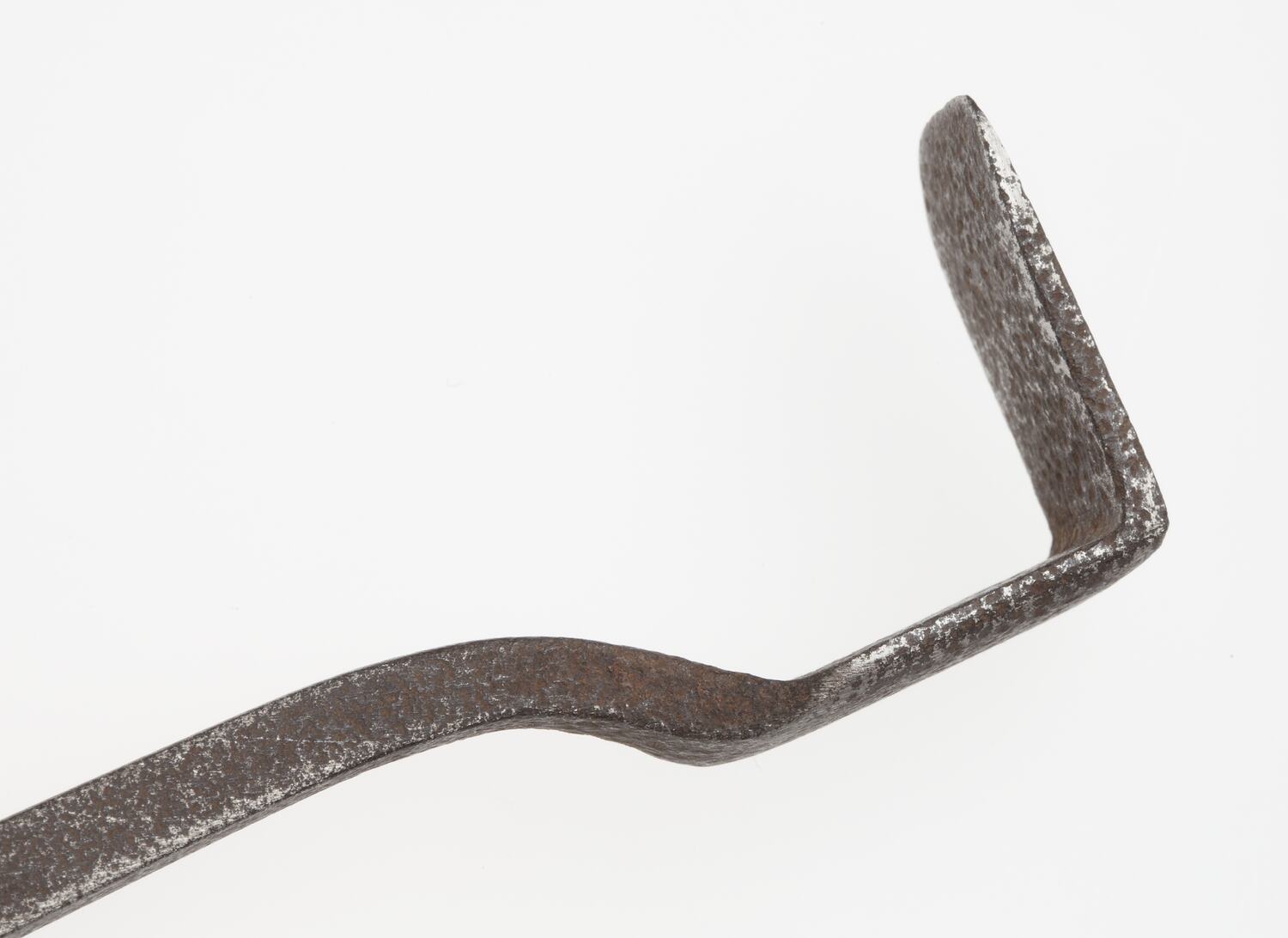 Metal tool with one long rectangular flattened end and the other end in an L shape.