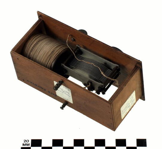 Consists of a wooden box with coil, crystal and single gang variable capacitor, with phone terminals on back of box. Some wires are loose.