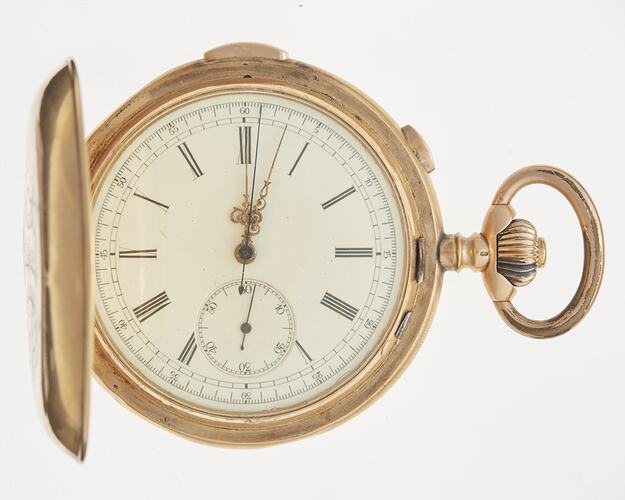 Gold hunter case with monogram on front. White enamel dial has arabic numerals for minutes, an inner circle of roman numerals for hours and a seconds dial at six. Has looped gold hands and black sweep second hand for stopwatch with button near 2. Stem and button wound spring; lever escapement. Has repeater striking on two coils.