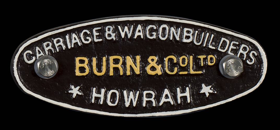 Builders plate for railway rollingstock, made by Burn & Co. Ltd., Howrah, West Bengal, India.