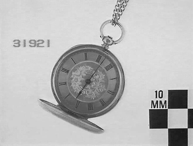 Gold hunter case is marked with floral design. Front cover is opened by button. Gold dial has floral centre and black roman numerals. Key wound spring; cylinder escapement. Six bar type movement. Gold chain with small brass key.